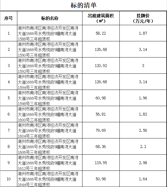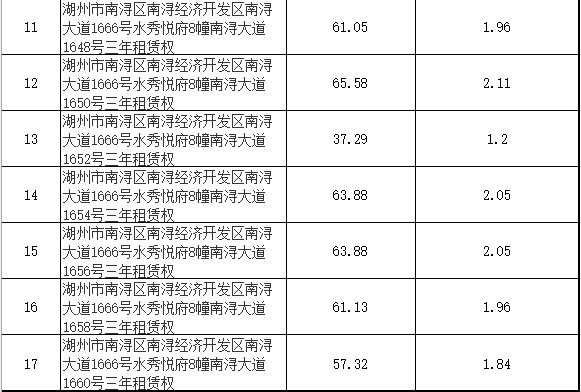 湖州市南潯區(qū)南潯經(jīng)濟開發(fā)區(qū)南潯大道1666號水秀悅府17處房屋三年租賃權分零招租,掛牌價格詳見標的清單,保證金每間均1萬元。